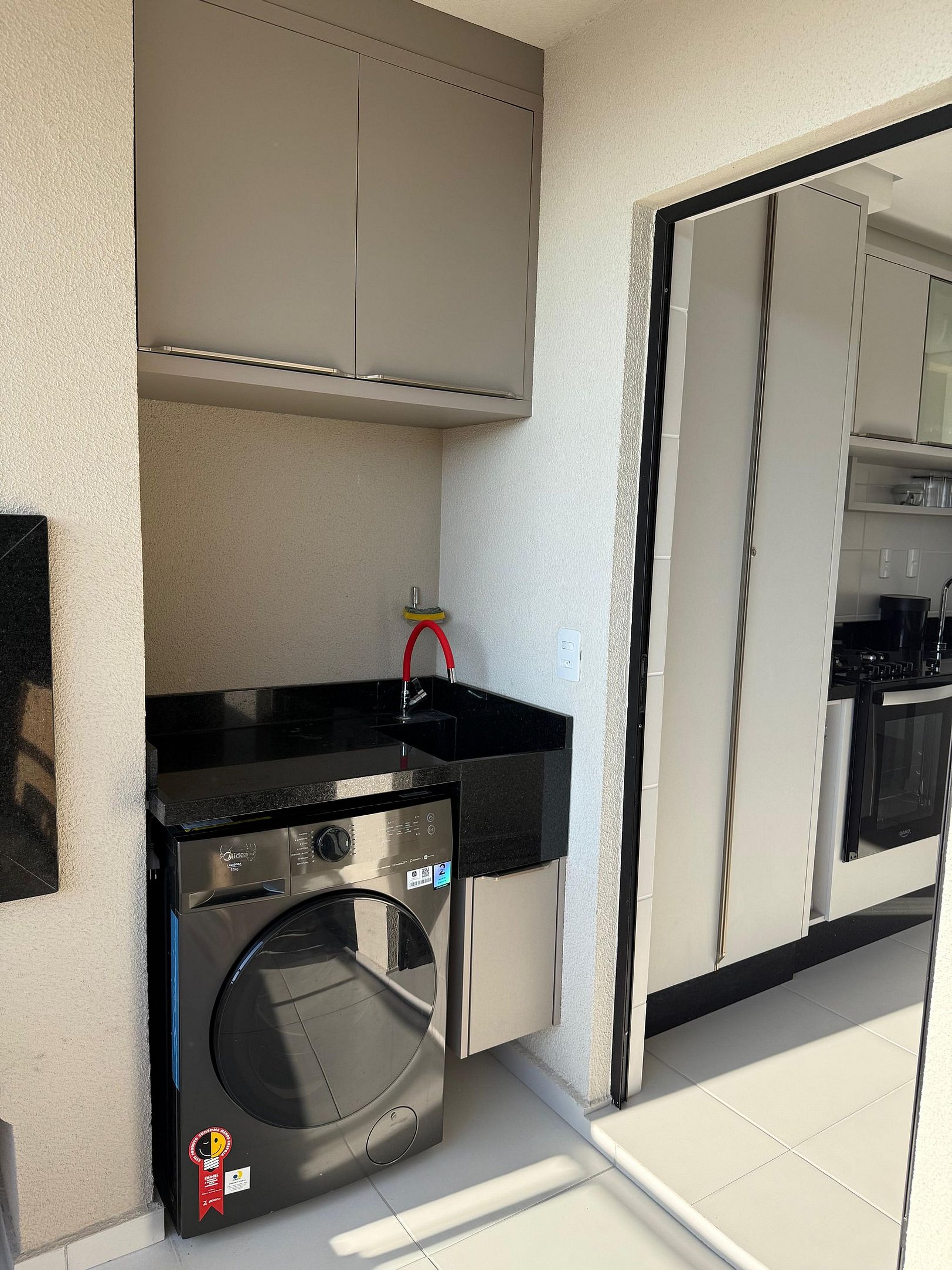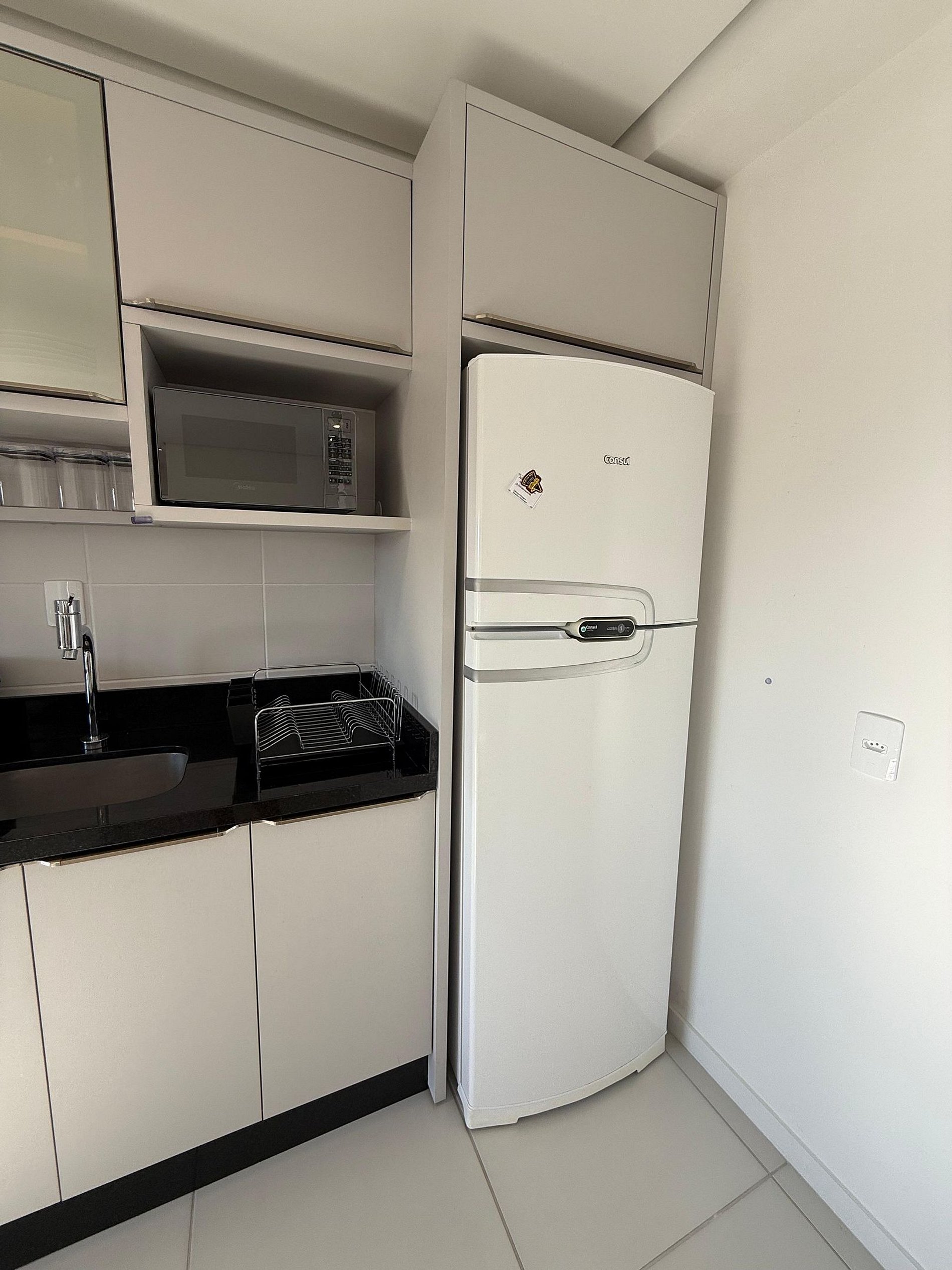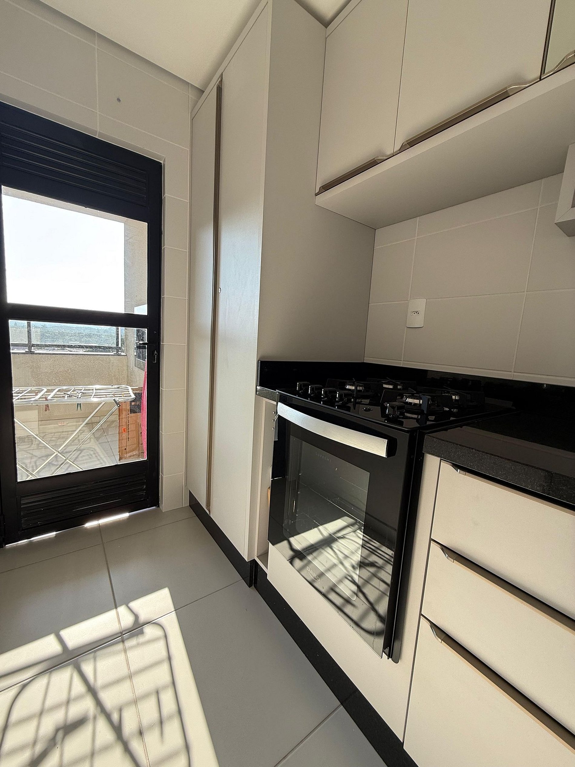 *Cozinha equipada com eletrodomésticos, utensílios e churrasqueira na sacada
