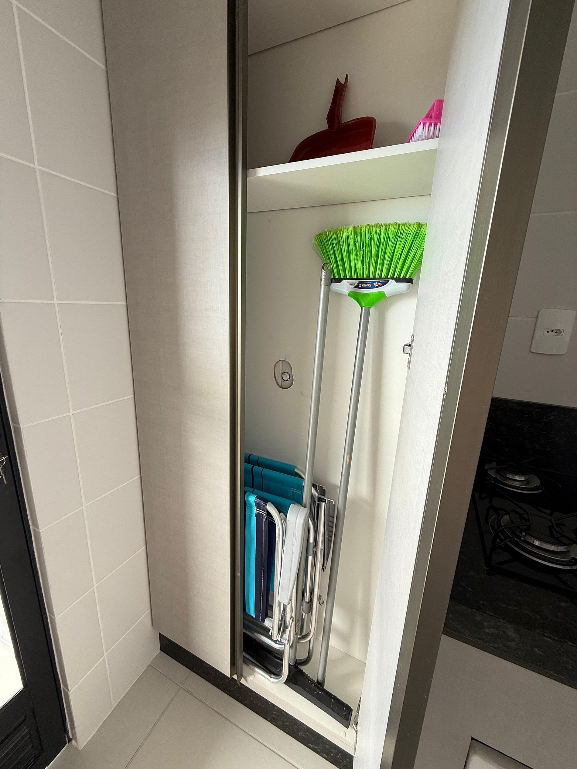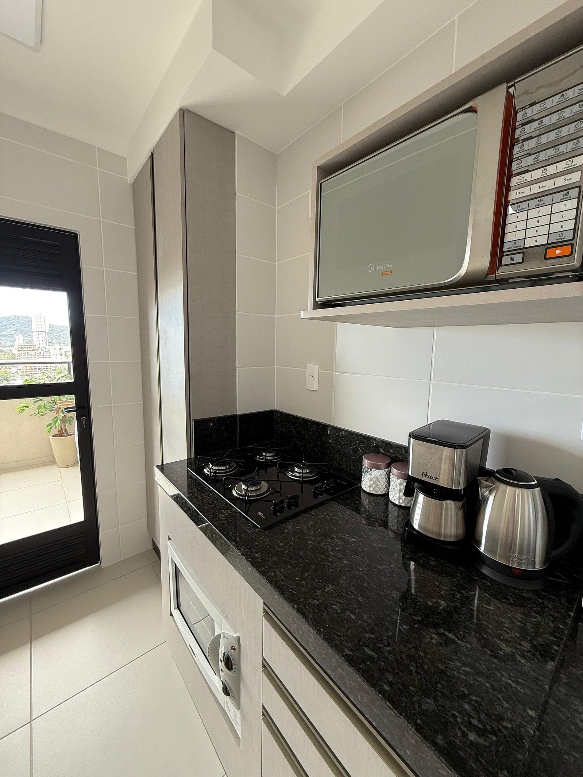 *Cozinha equipada com eletrodomésticos, utensílios e churrasqueira na sacada